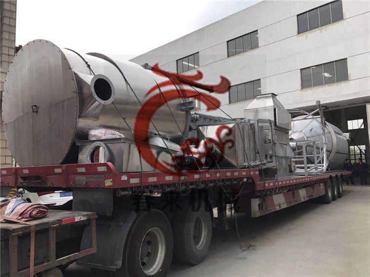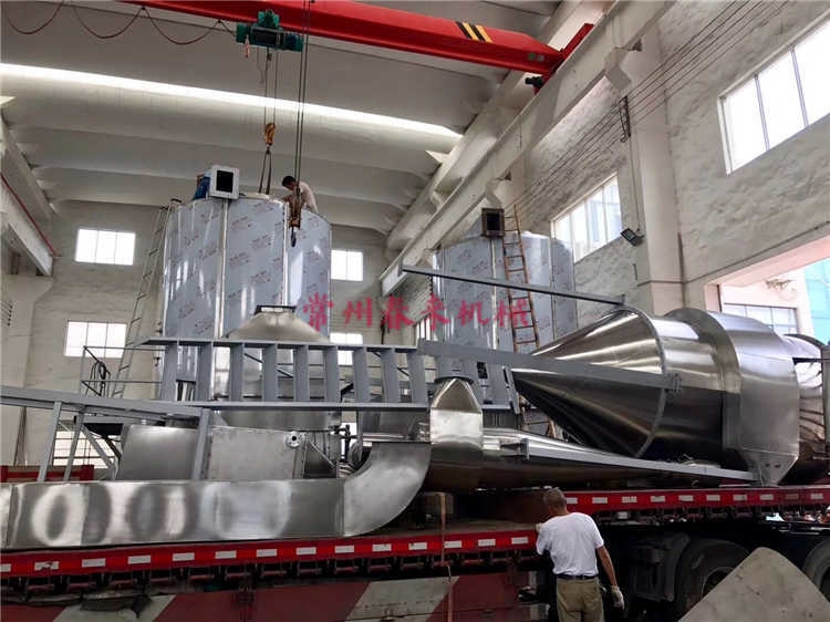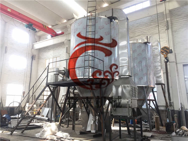 空氣經過濾和加熱,進入干燥器頂部空氣分配器,熱空氣呈螺旋狀均勻地進入干燥室。料液經塔體頂部的高速離心霧化器,(旋轉)噴霧成極細微的霧狀液珠,與熱空氣并流接觸在極短的時間內可干燥為成品。成品連續地由干燥塔底部和旋風分離器中輸出,廢氣由風機排空。、