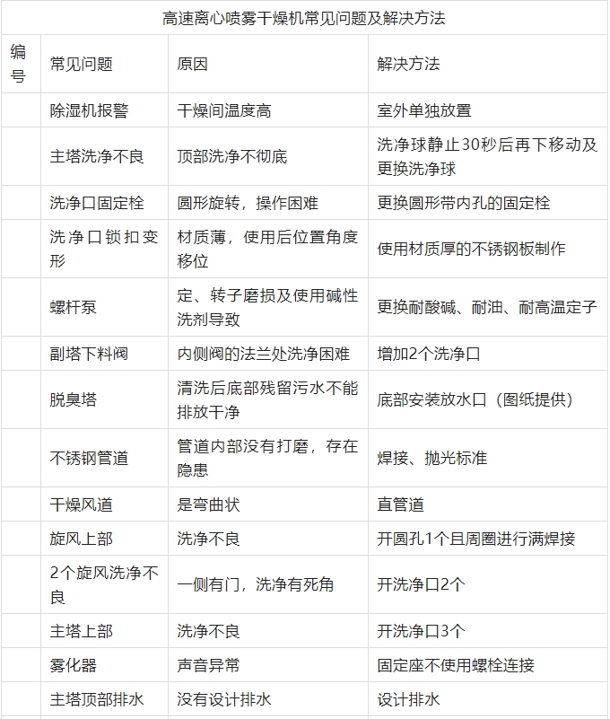 本公司針對在離心噴霧干燥機的研發與生產制造過程中,常遇見一些的問題,經過多年的經驗總結了如下問題解決方法,僅供參考: