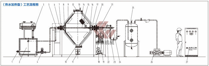 該搖罐罐體中間為圓柱形,兩端為圓錐形,圓錐頂部設進料口(兼作人孔)、出料口(兼作加藥孔)、罐體內、外共分三層,中間夾套加熱介質是循環熱水,保溫層為中堿超細玻璃棉,耗能極少;內層投放物料,在真空條件下進行旋轉預先加溫干燥,物料邊翻動邊通過器壁及導流板獲取熱量,加速加溫及干燥,且混合均勻,這樣避免了熱敏性物料在干燥時表面返黃的現象,并大大縮短了物料加熱干燥時間。添加劑加入后再通過加壓,使添加劑能快速均勻的滲透到物料中。而后再微負壓狀態下,將物料表面熔融后的添加劑進行干燥固化。整個操作過程均可帶記錄儀控制,以便對每批物料的產品質量可控可追溯。