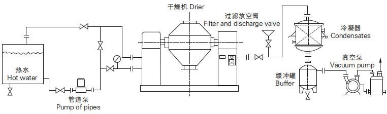 雙錐回轉真空干燥機是在密閉的夾層中通入熱能源(如熱水,低壓蒸汽或導熱油),熱量經內殼傳給被干燥物料。雙錐真空干燥機物料處于真空狀態,蒸汽壓下降使物料表面的水份(溶劑)達到飽和狀態而蒸發了,并由真空泵及時排出回收。雙錐真空干燥機物料內部的水份(溶劑)不斷地向表面滲透、蒸發、排出三個過程不斷進行,物料在很短時間內達到干燥目的。